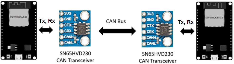 ตัวอย่าง CAN transceiver ที่นิยมใช้กับ ESP32 เช่น SN65HVD230 ซึ่งทำงานที่แรงดัน 3.3V เหมาะกับ ESP32 โดยตรง